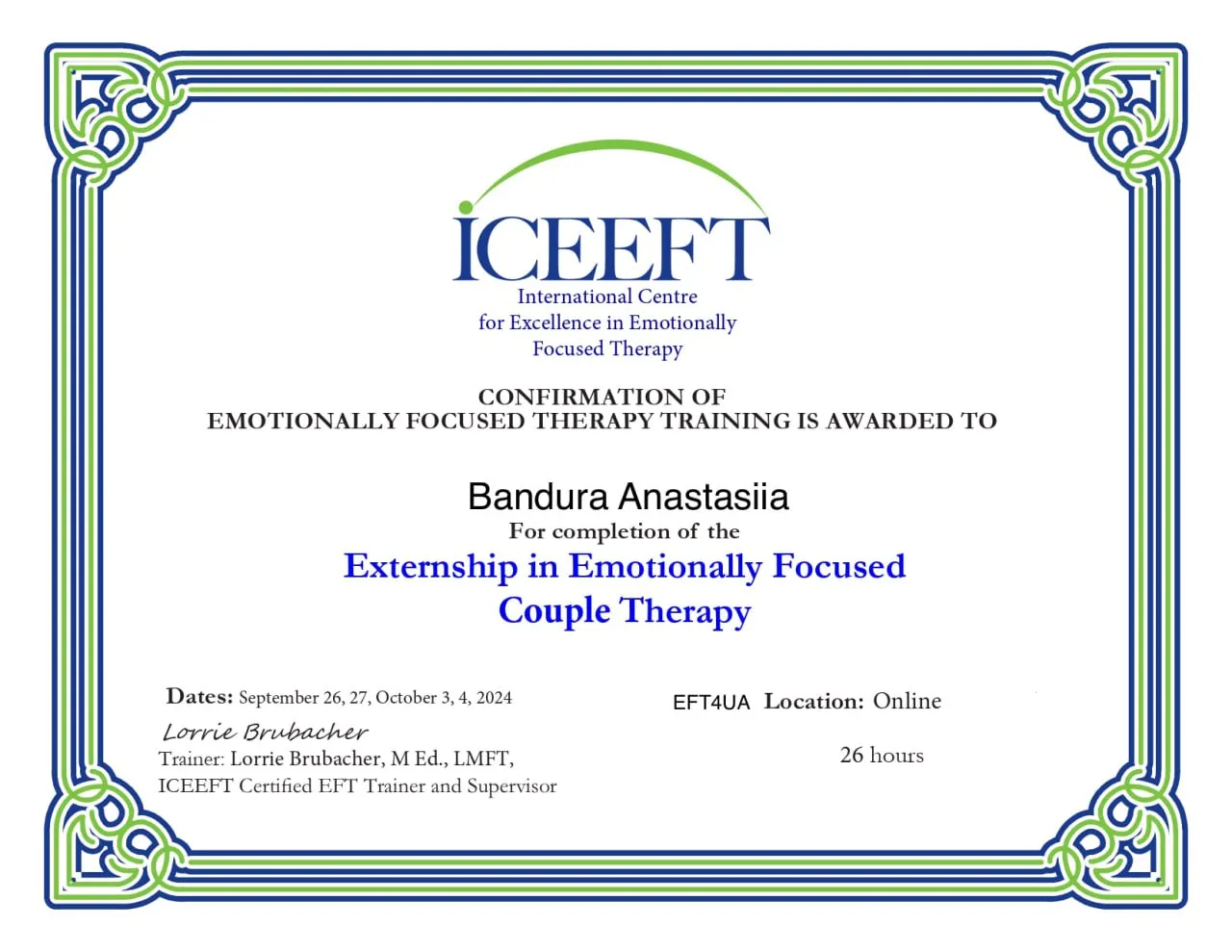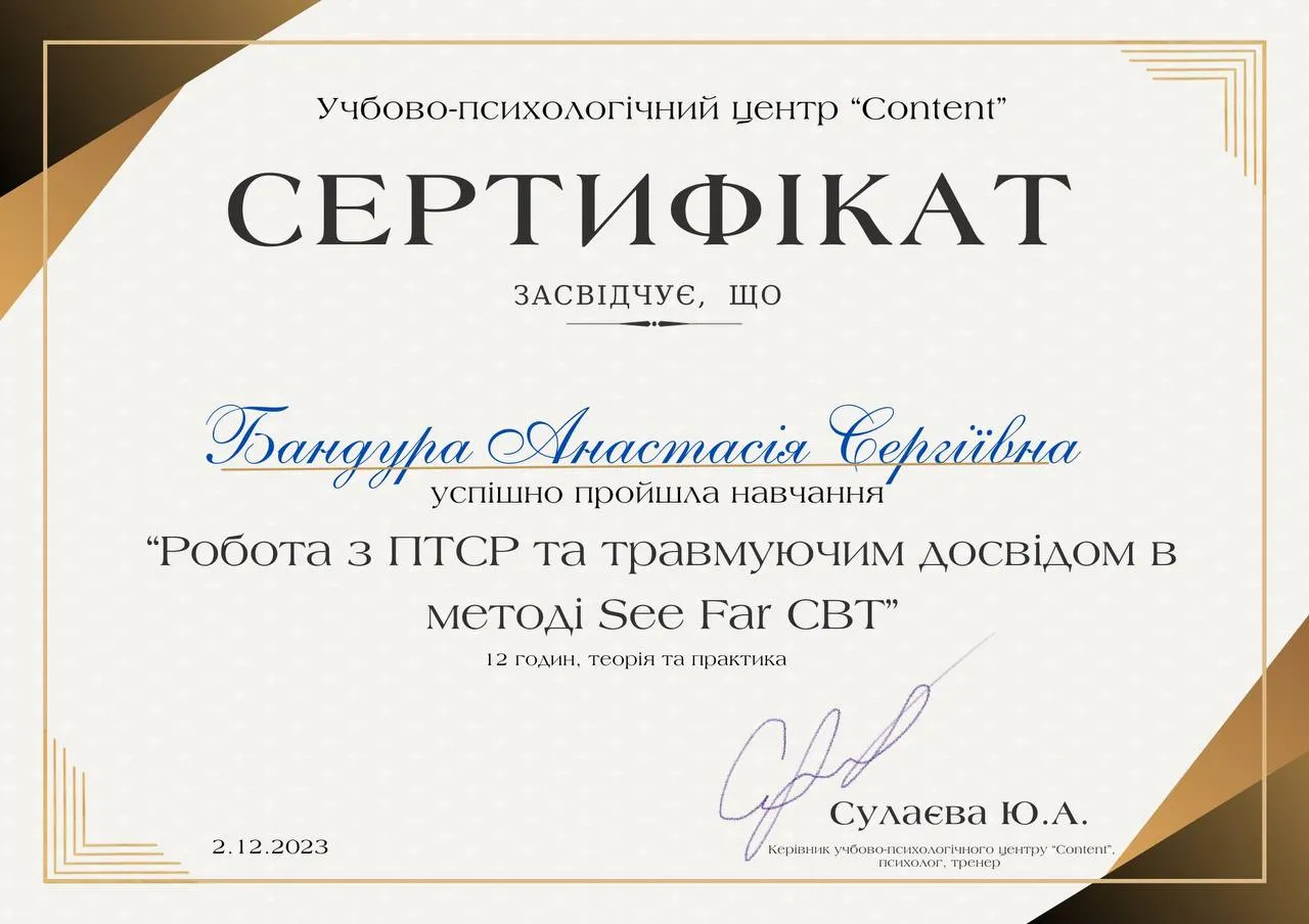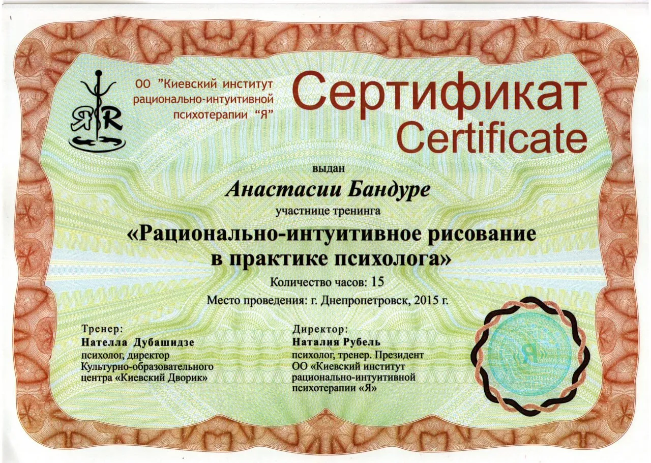 2015 - Rational and intuitive drawing in the practice of a psychologist, NGO “Kyiv Institute of Rational-Intuitive Therapy.