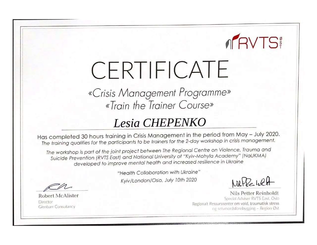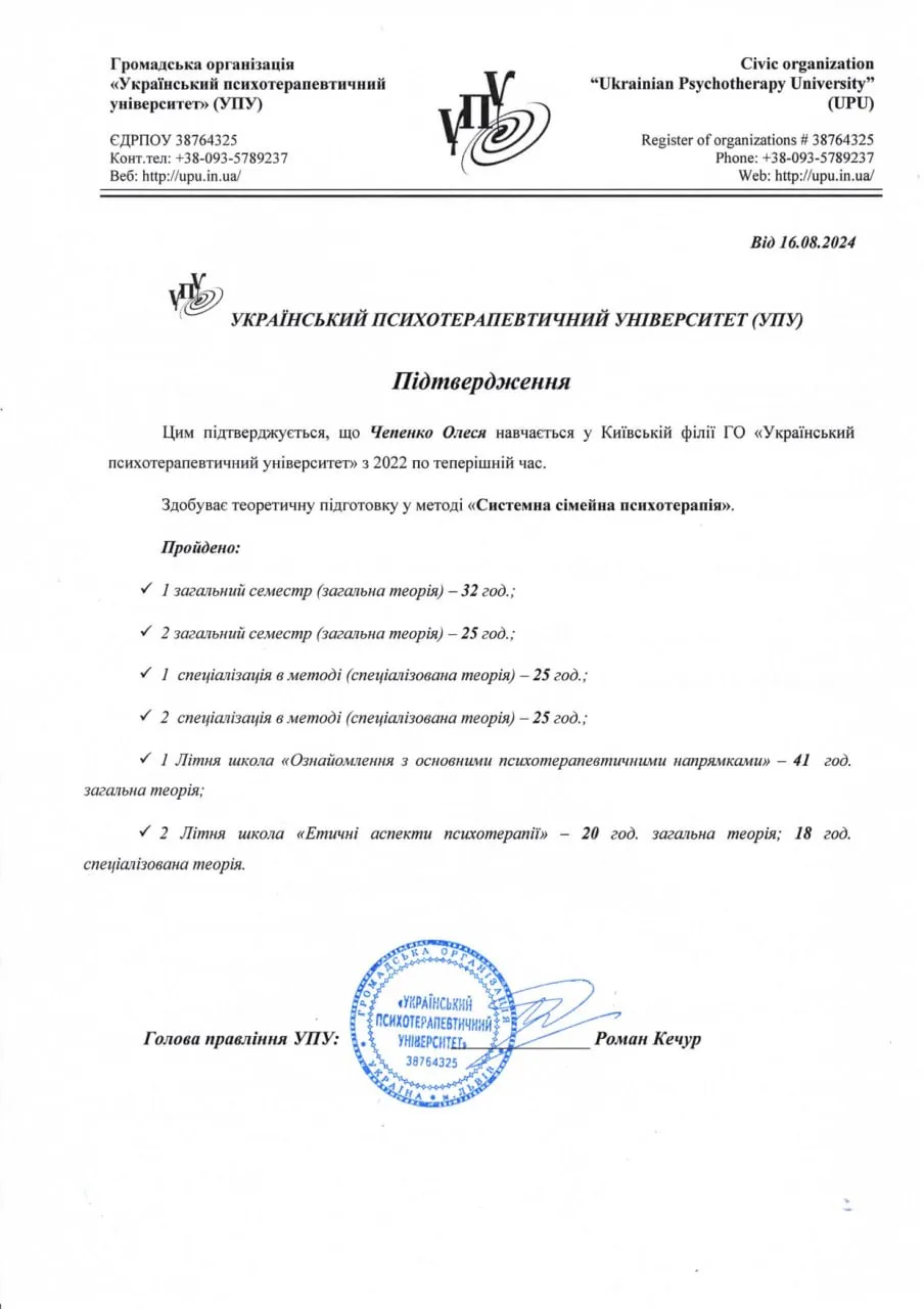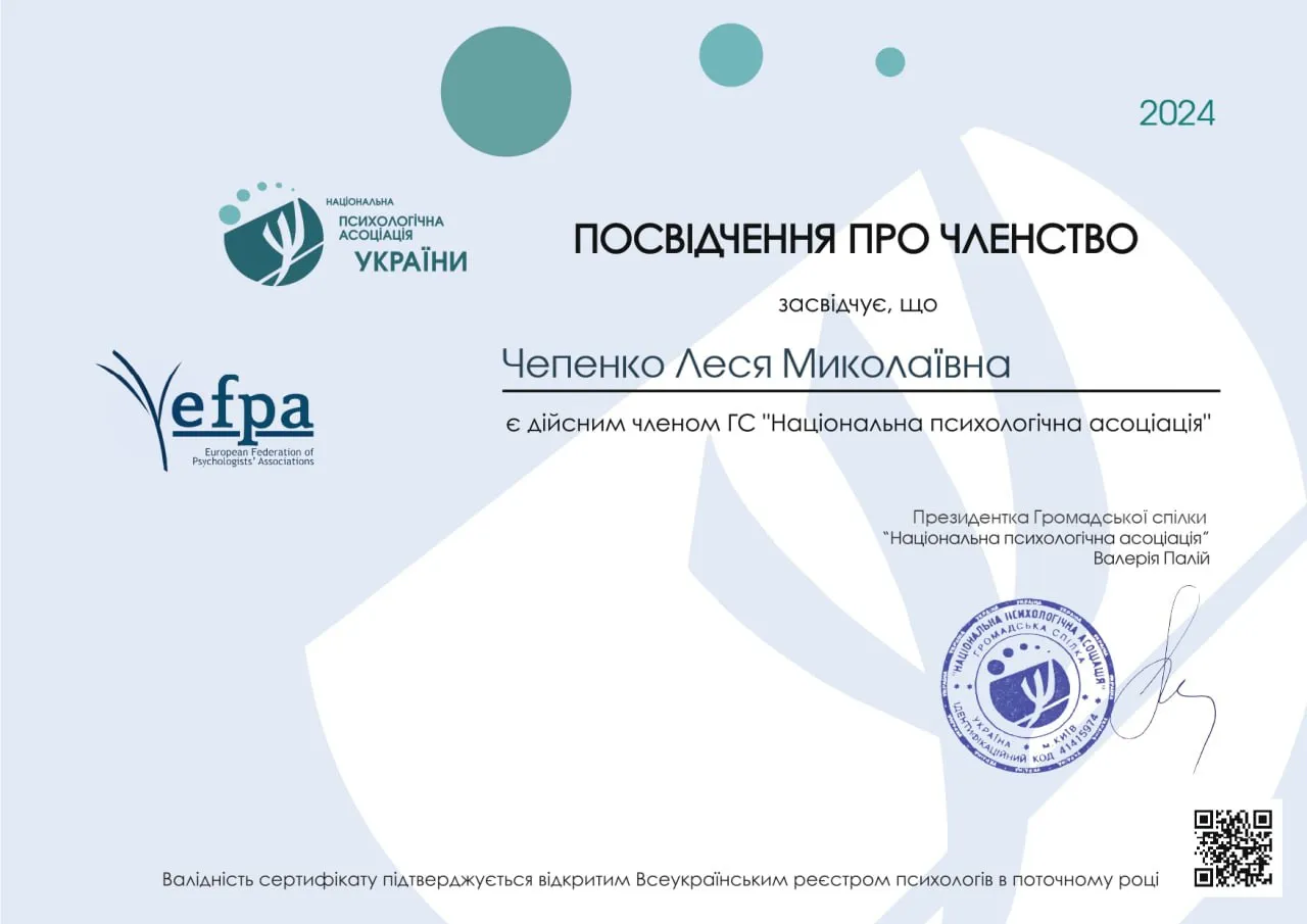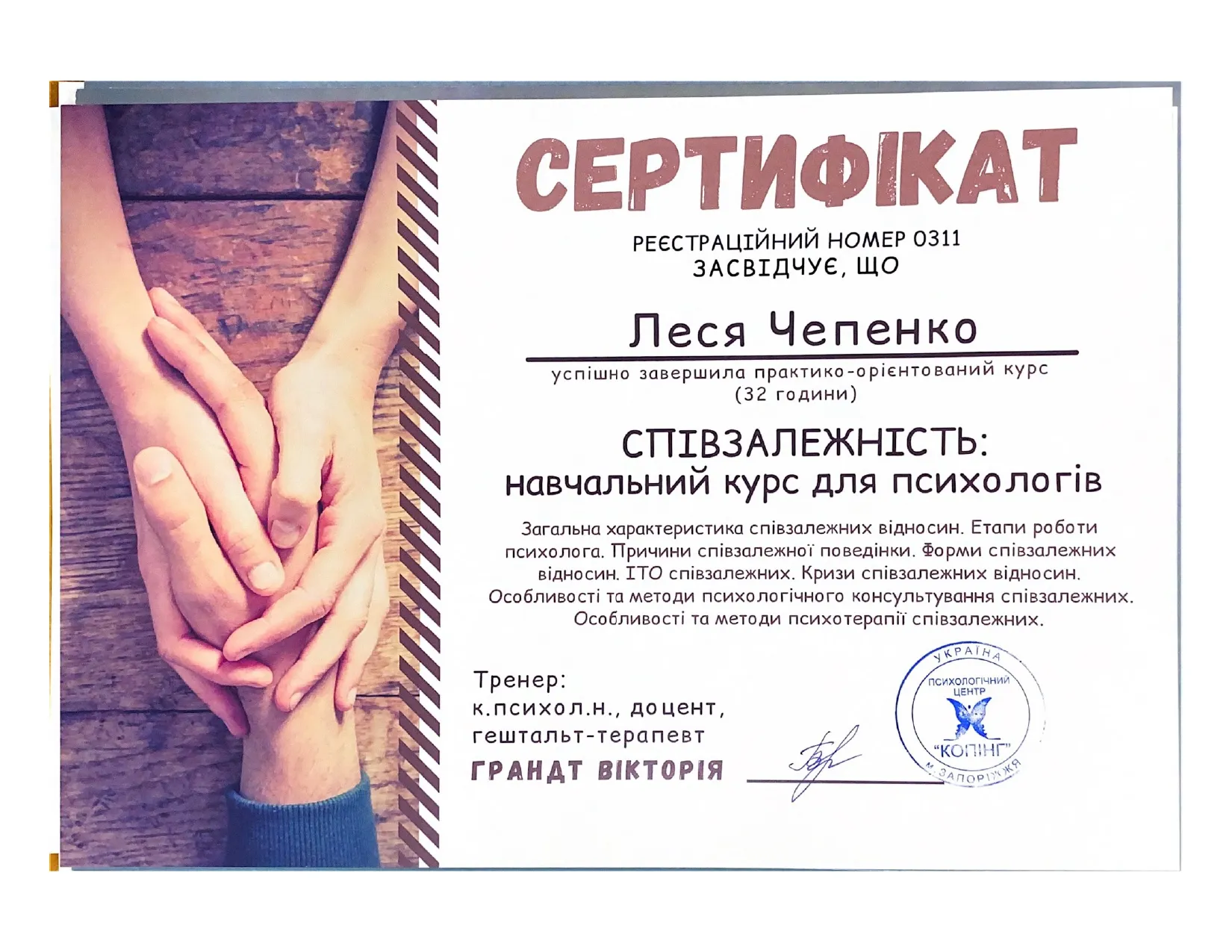 Психологічна підтримка клієнтів зараз для мене є необхідною та пріоритетною задачею. Тому я постійно у професійному пошуку та навчанні, у 2022 році почала навчання в Київській філії Українського психотерапевтичного університету, здобуваю теоретичну підготовку у методі системної сімейної терапії. Дитячо-батьківські відносини, сімейні стосунки, співзалежність – ті запити, з якими працюю також. Маю особисту психотерапію, учасниця п’ятирічного проєкту з групової психотерапії «Першої Київської школи психотерапії», за напрямком : системна сімейна терапія» з 2021 року.