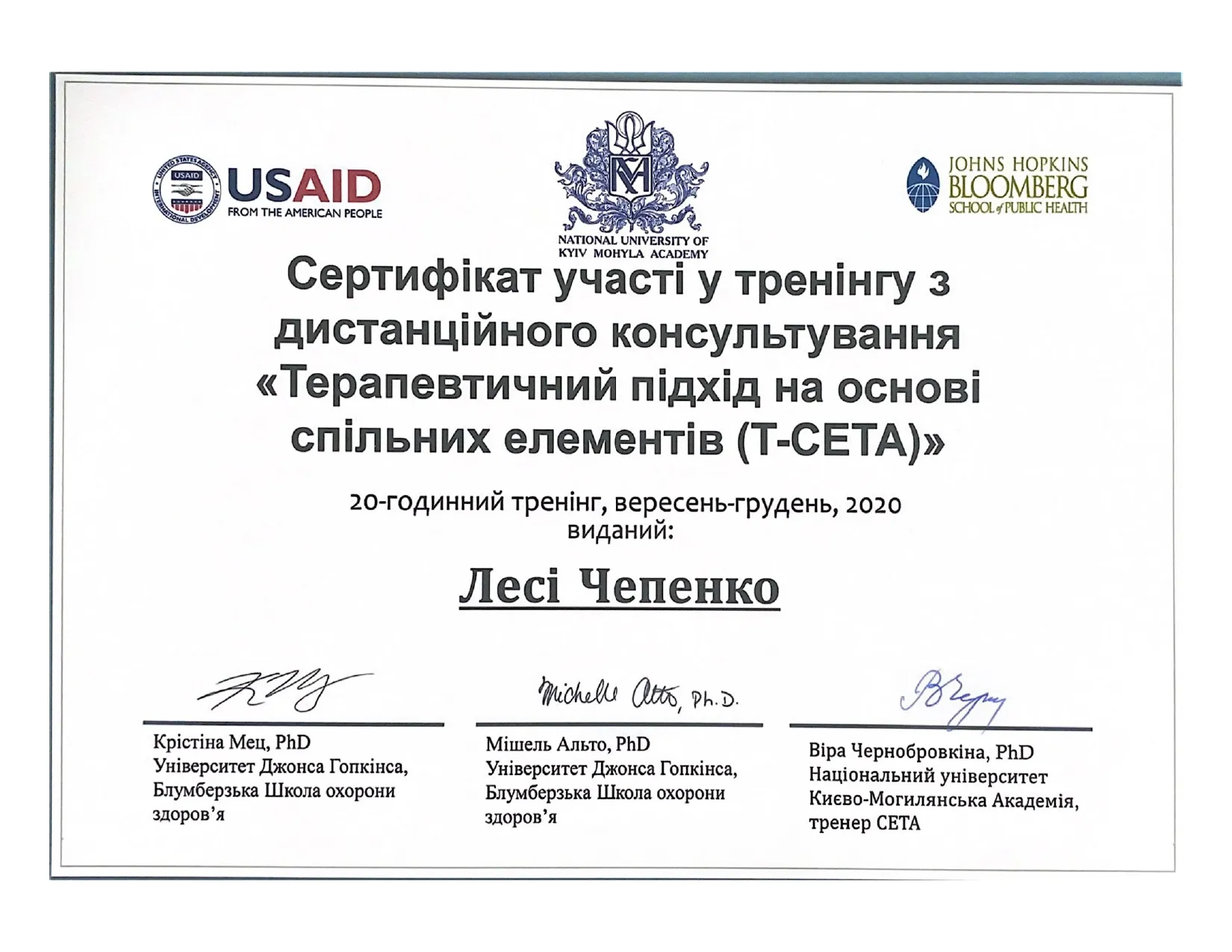 2020 - Терапевтичний підхід на основі спільних елементів - CETA (НаУКМА, університет Джонса Хопкінса, США).