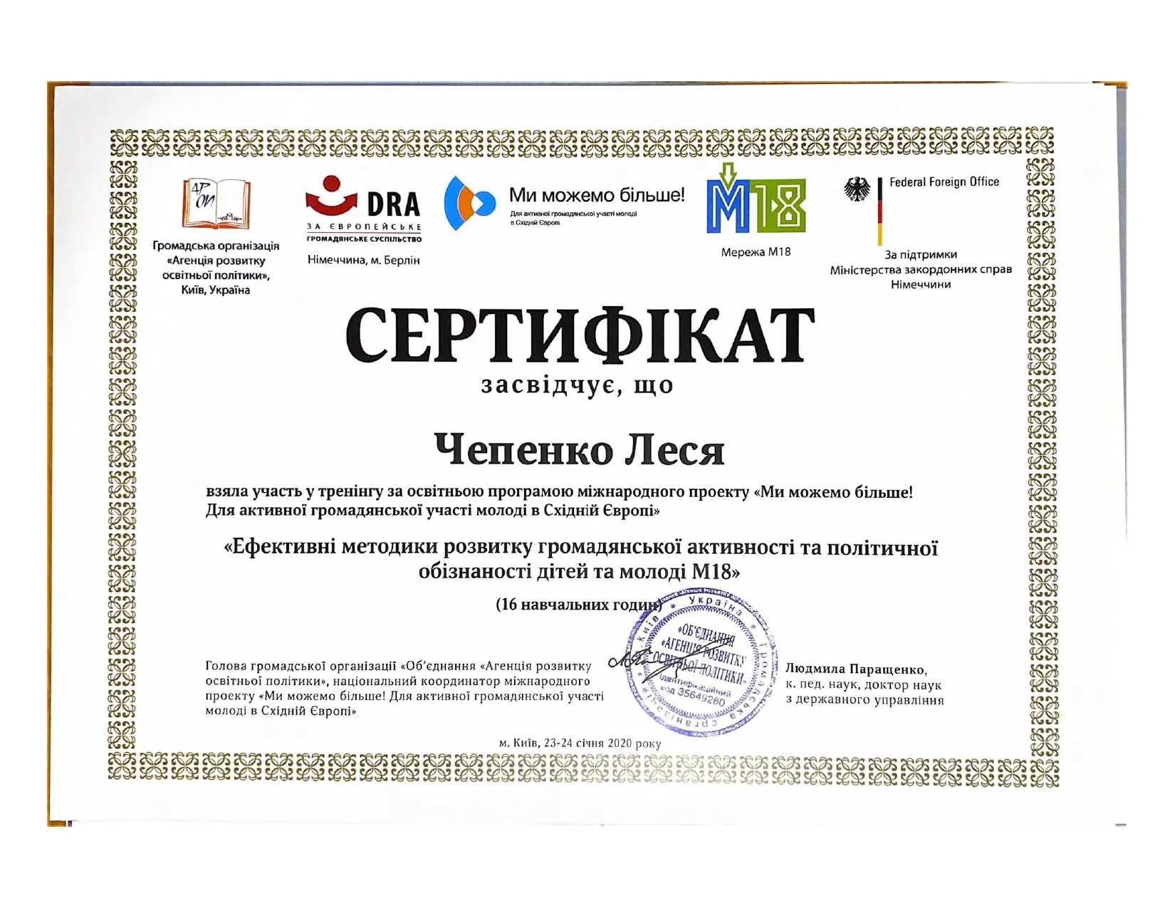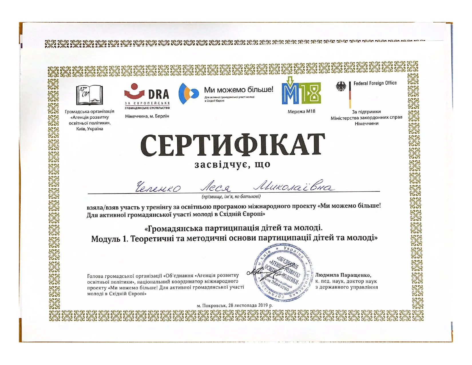 2019 - Освітня програма міжнародного проєкту "Ми можемо більше!" громадської організації "Об'єднання " Агенція розвитку освітньої політики". Модуль "Теоретичні та методичні основи партиципації дітей та молоді".