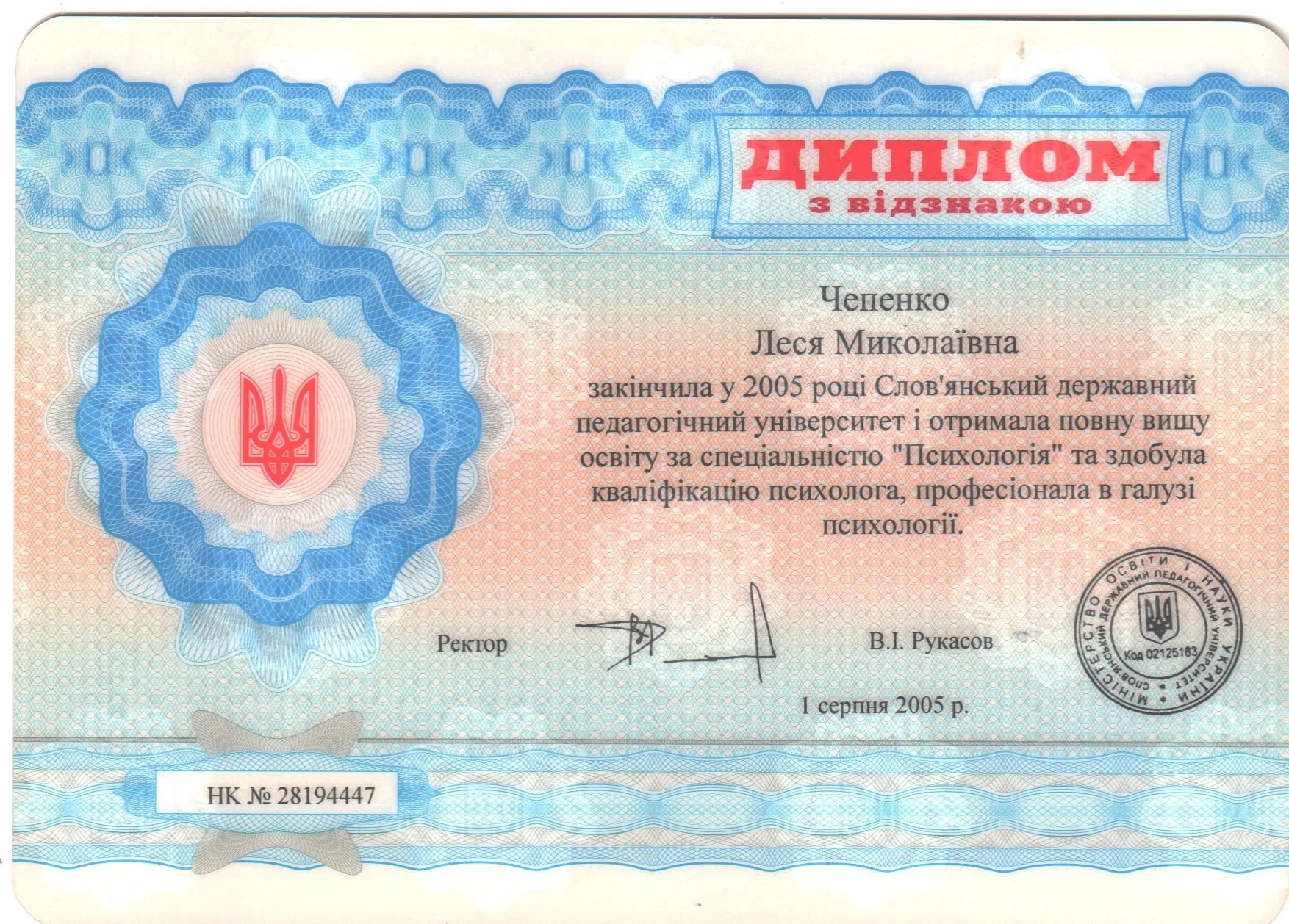 2005 – Слов’янський Державний педагогічний університет, спеціальність за дипломом «Психолог».