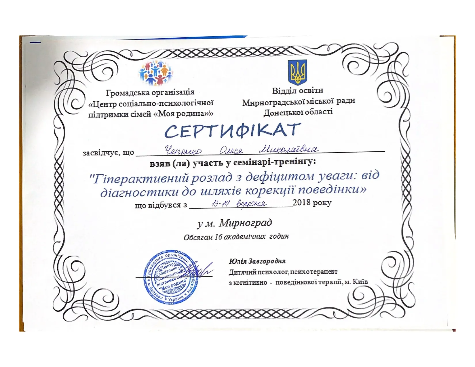2018 - Гіперактивний розлад з дефіцитом уваги: від діагностики до шляхів корекції поведінки. Громадська організація "Центр соціально-психологічної підтримки сімей "Моя родина".