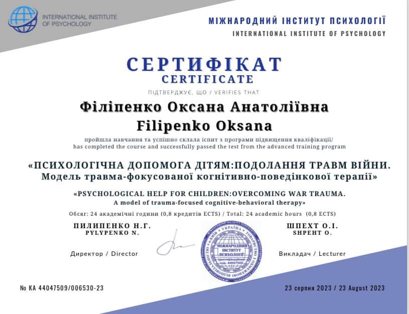 2023 р. - «Психосоціальна допомога дітям: Подолання травм війни. Модель травма-фокусованої когнітивно-поведінкової терапії», Міжнародний інститут психології.