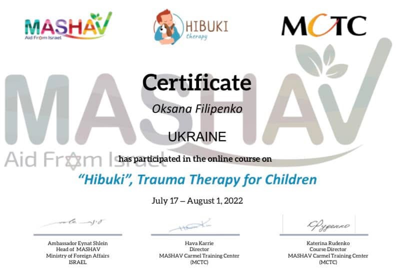 2022 р. - «Hibuki», TraumaTherapy for Children», MASHAV/MCTC.