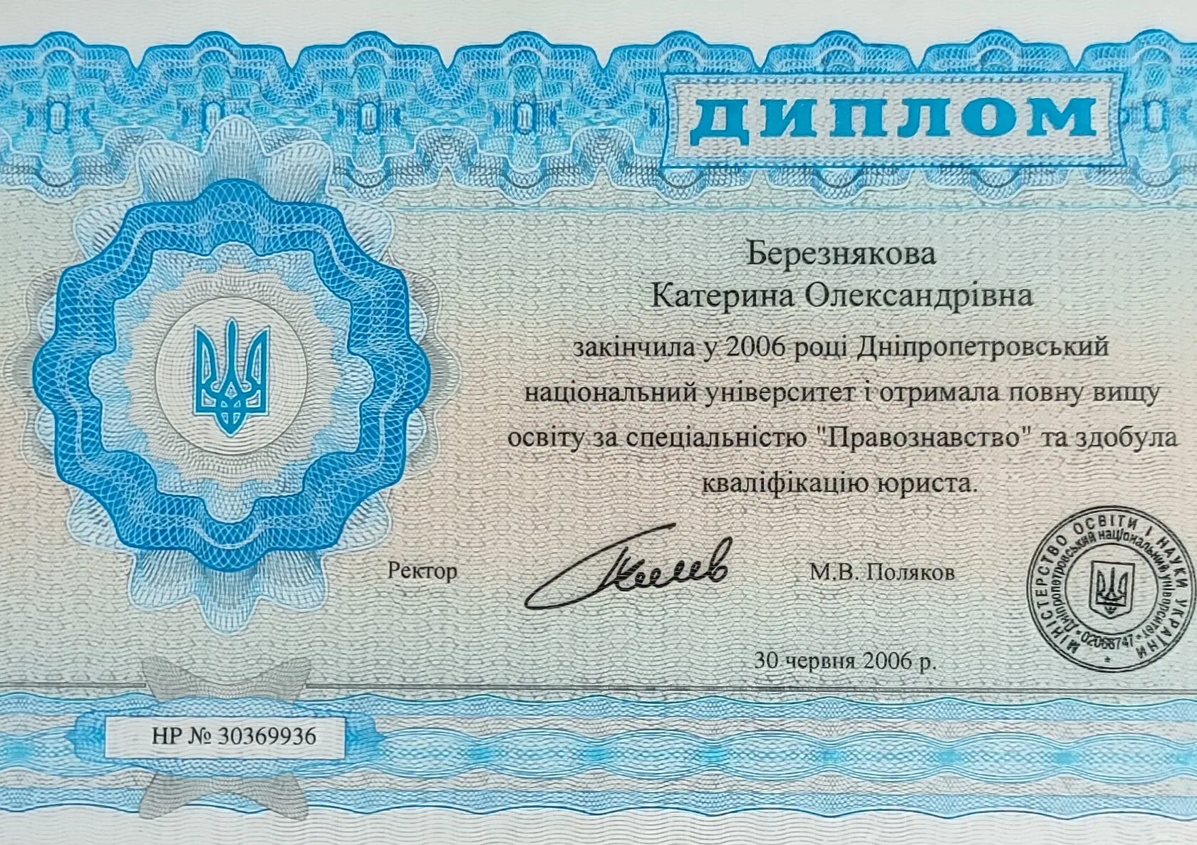 - 2006 - Дніпропетровський національний університет, юрист