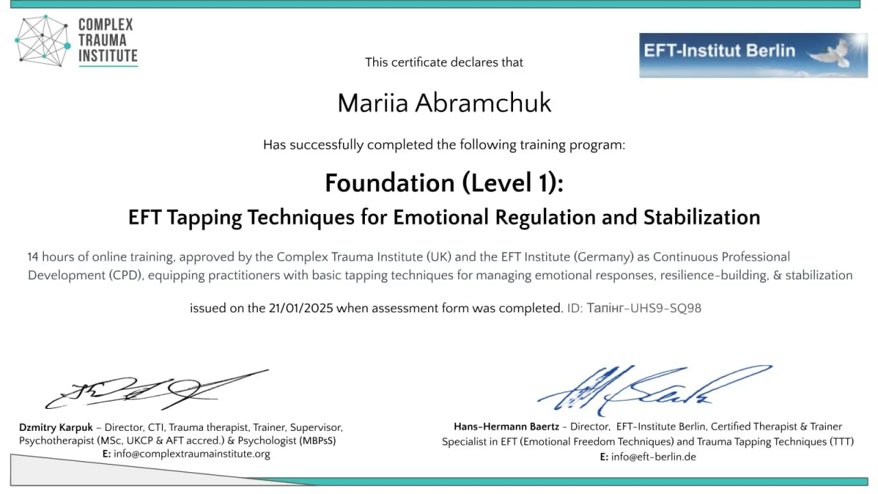 - «Кваліфікаційний курс НЛП-практик» (Катерина Мілютіна, Україна, 2006, сертифікація)