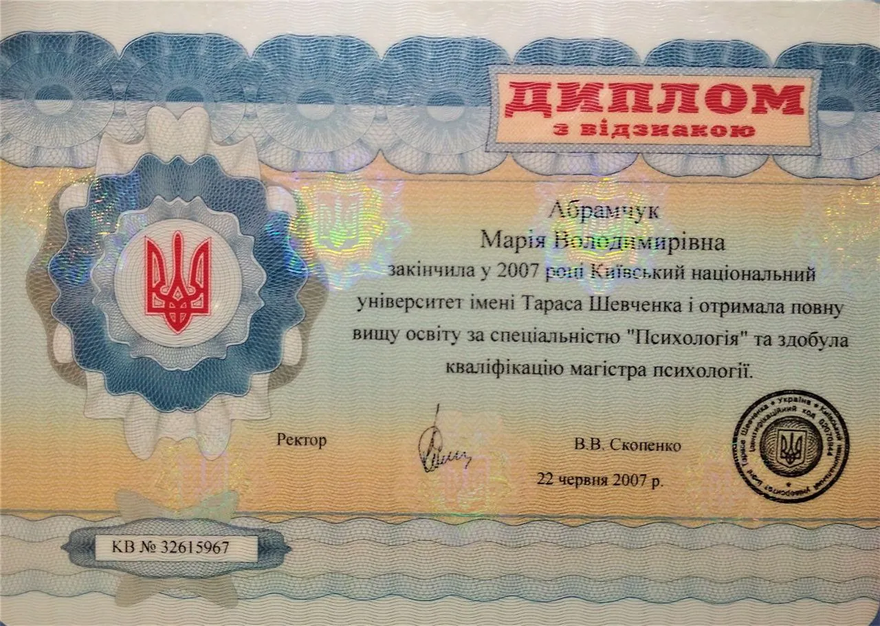 2007 — Магістр психології (Київський національний університет імені Т.Г. Шевченка)