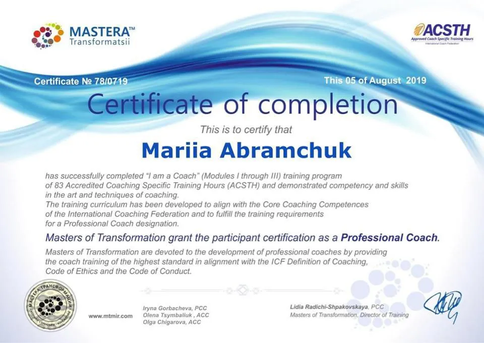 2019 — Сертифікований Коуч (Майстри Трансформації)