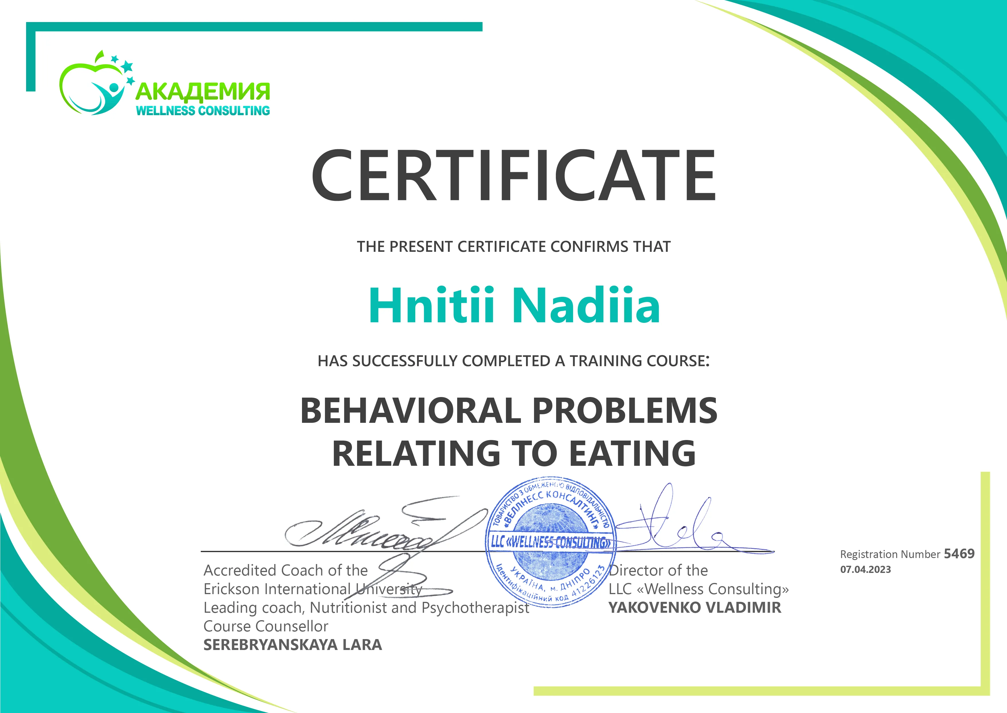 - Тренінговий курс « Nutrition and weigt correction consultant. The basic of practical dietology and nutriciology», 2021 р.