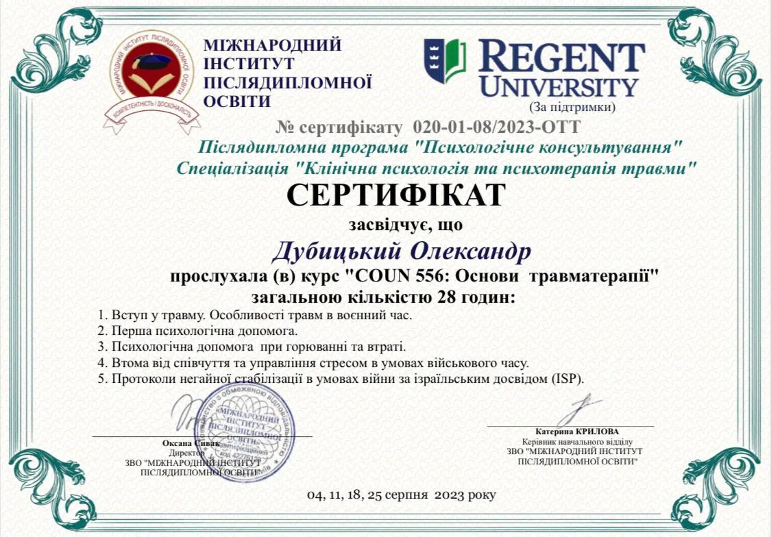 2023 - Міжнародний інститут післядипломної освіти. Основи травматерапії.