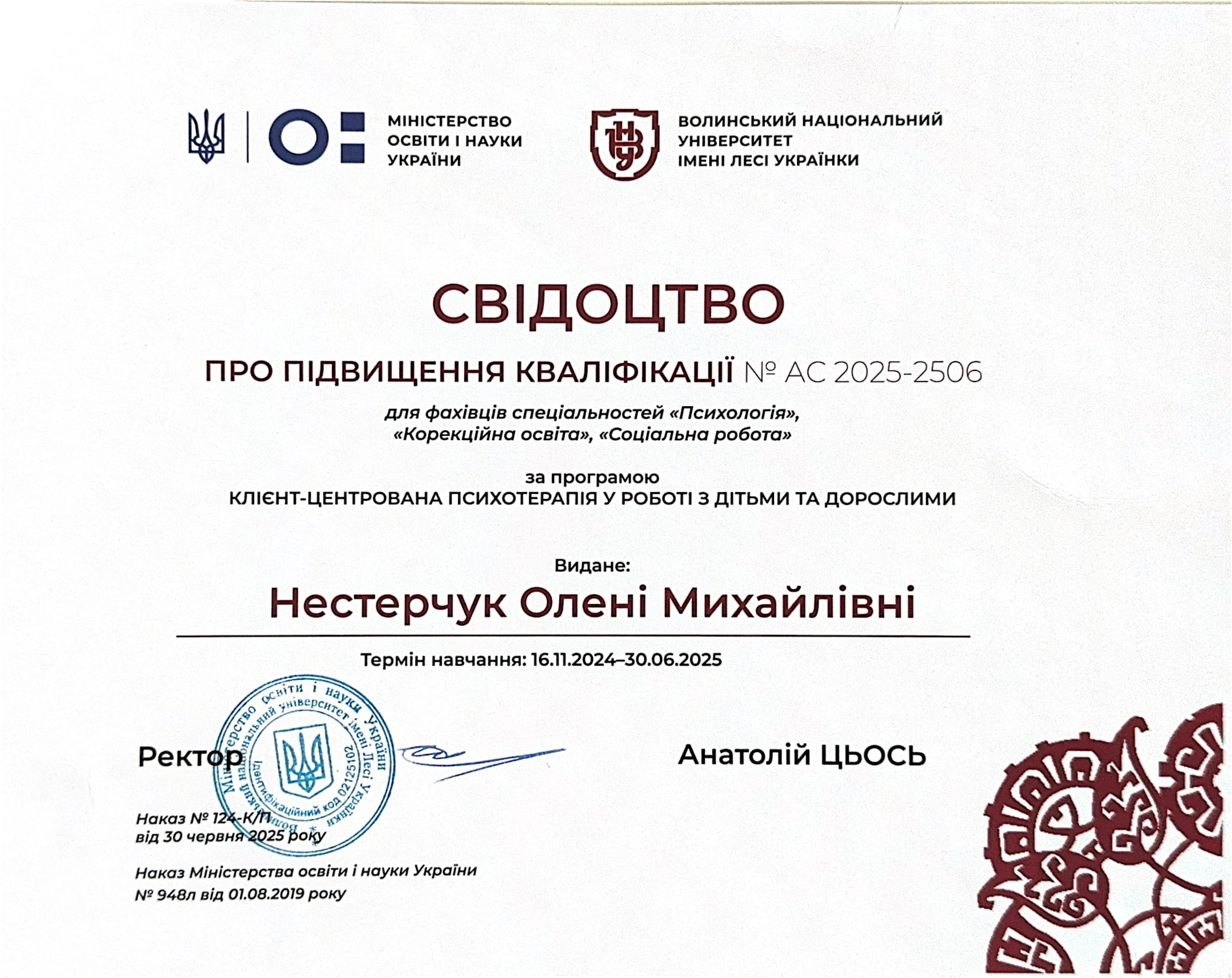 2018 - Інститут післядипломної освіти ім. Т.Г. Шевченка, Спеціаліст, спеціальність «Психологія»