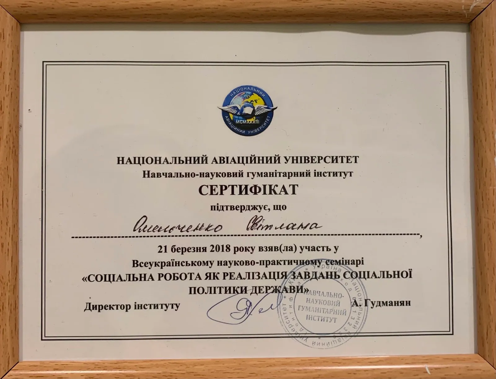 2018 - Участь у Всеукраїнському науково-практичному семінарі "Соціальна робота як реалізація завдань соціальної політики держави" з проведенням тренінгу «Персональна Трансформуюча Метафора"