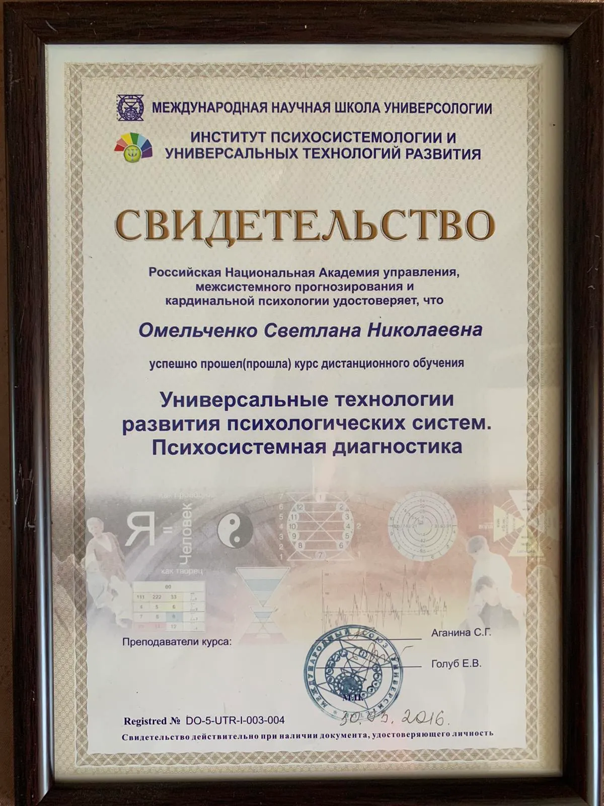 2016 - Інститут психосистемології та універсальних технологій розвитку Російської Національної Академії управління, міжсистемного прогнозування та кардинальної психології - курс "Універсальні технології розвитку психологічних систем. Психосистемна діагностика"
