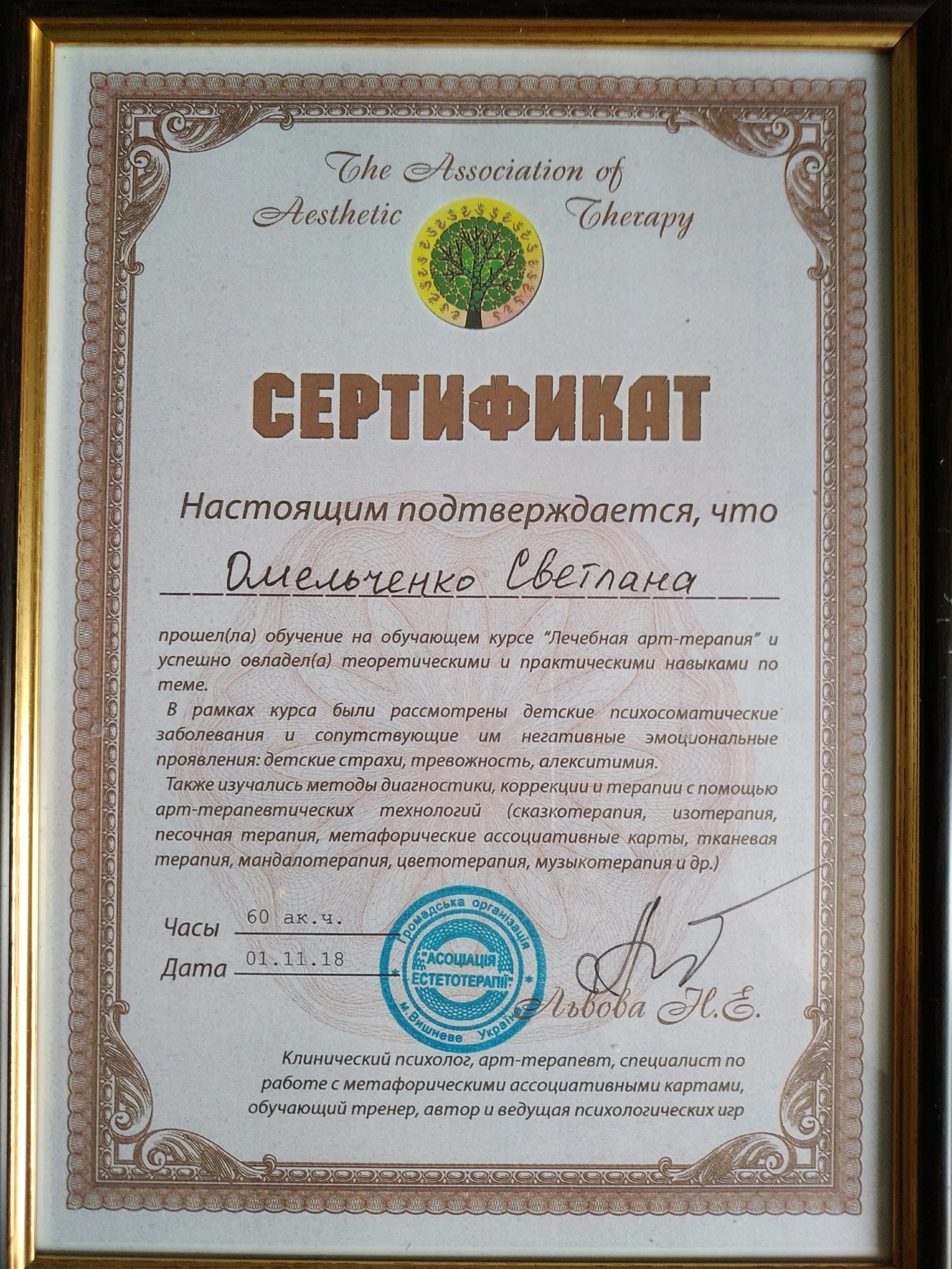 2018 - Курс "Лікувальна арт-терапія" The Association of Aesthetic Therapy»